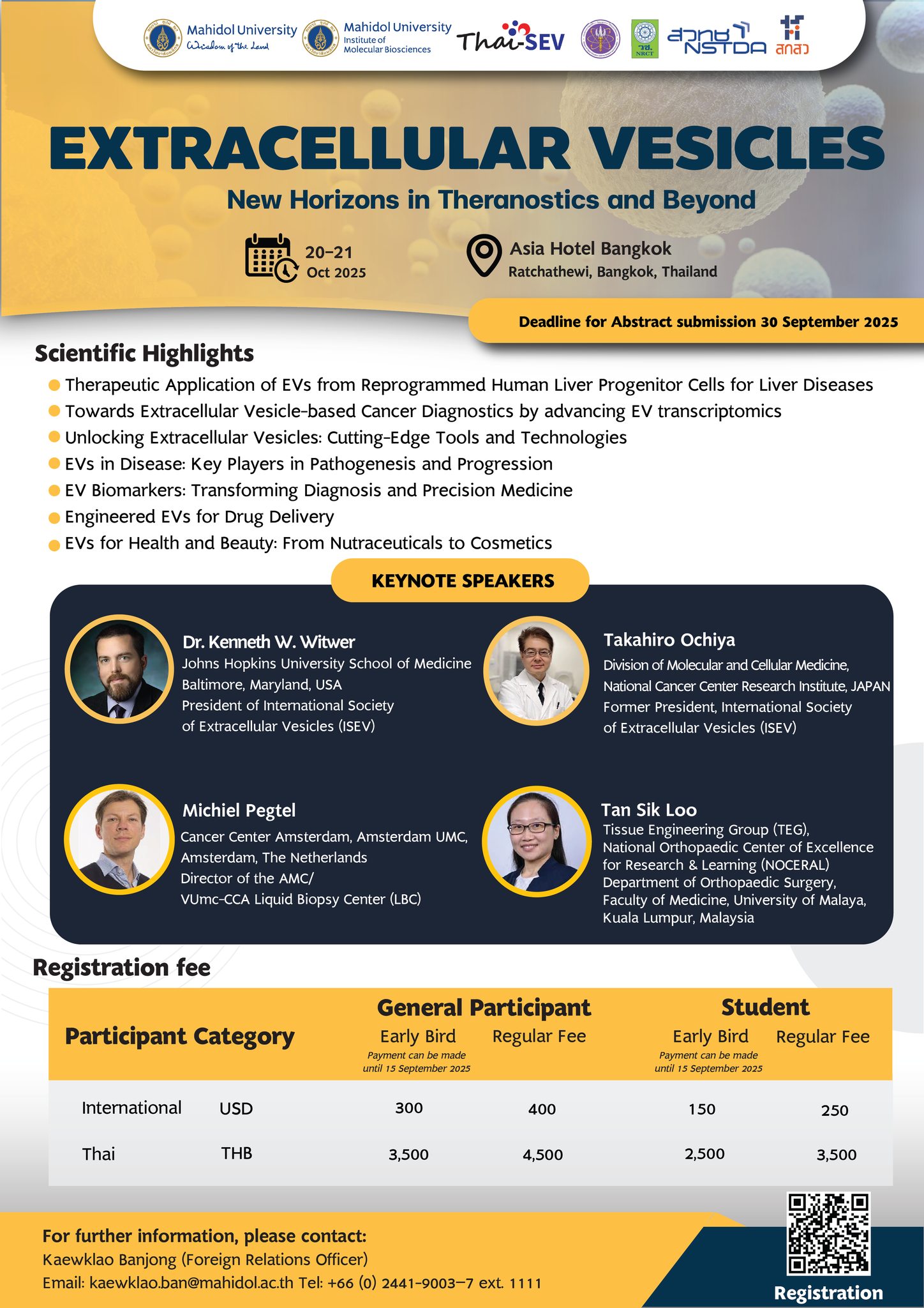 Don’t miss this exciting opportunity to connect, share, and shape the future of EV research! For more information, please contact: Kaewklao Banjong (Foreign Relations Officer) Email: kaewklao.ban@mahidol.ac.th | Tel: +66 2441-9003–7 ext. 1111 Register now via our website: https://mb.mahidol.ac.th/web/extracellular-vesicles/ |